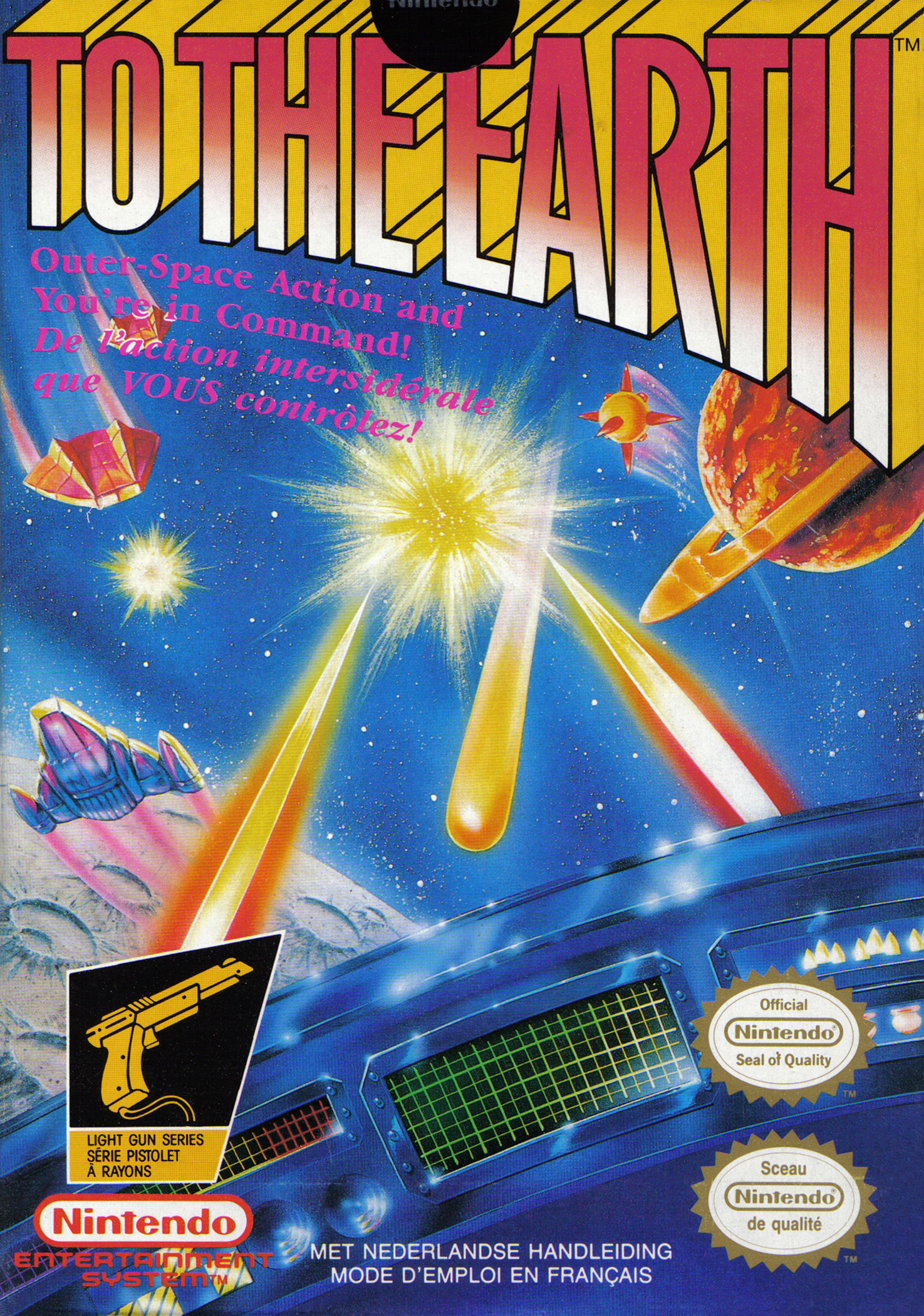 | __long_description | To The Earth is a 1989 light gun-based space shooter developed and published by Nintendo. The plot of the game is Earth has been invaded by aliens and held hostage by a powerful bacteriological weapon, and the player is a pilot on a mission to bring back an antibacterial agent that can save it.
