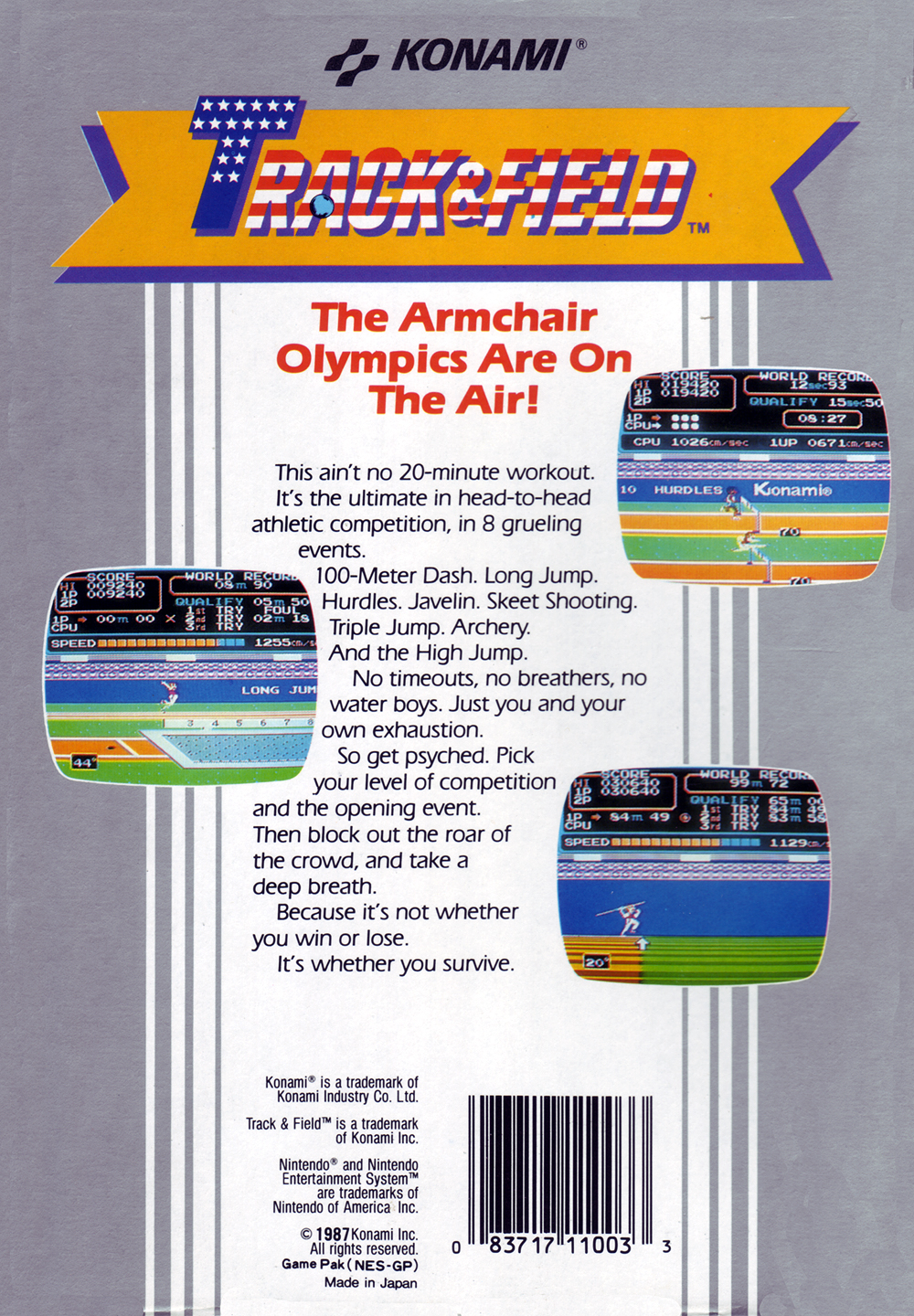 The Famicom version loses the hammer throw and the high jump, but the NES version restores the high jump while adding skeet shooting, the triple jump and archery as events. The NES version also keeps the 110 meter hurdles and forgoes the 400 meter dash.