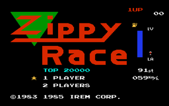 MotoRace USA is a vertically-scrolling top-down motorcycle racing game that alternates to a behind-the-bike view for the latter half of each of its races. It was first released in the Arcades in Japan as Zippy Race. The game was ported to the Sega SG-1000, a predecessor of the Master System, and was also Irem's first game for the Nintendo Famicom - both of these ports are Japan-exclusive. It would also be included in the Irem Arcade Classics compilation for the Sega Saturn and Sony PlayStation.