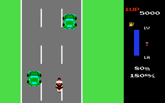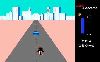 In a game reminiscent of both Road Fighter and Rally Bike, the player takes control of a motorcyclist who's in a race to be the first to traverse the United States.