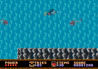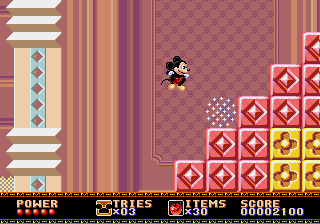 Mickey's main method of attack is to perform a 'bounce' whilst jumping, which can be used to defeat enemies, or to bounce upwards towards higher areas. Mickey can also collect projectiles such as apples and marbles to throw at his opponents. There are various items that earn bonus points, increase the player's health and grant extra lives.