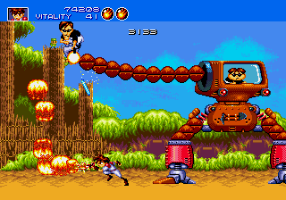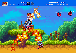 Gunstar Heroes is a side scrolling shooter. The player has four weapons to choose from, and these four can be combined in pairs to create an additional 10 weapons, for a total of 14. In addition to the weapons, the player can engage enemies in close quarters combat. It is possible to grab and toss enemies, perform sliding and jumping attacks and a long-range skid. Unlike most games in the genre, the player has a life total calculated in numbers. Death to a player requires multiple hits but just one death will issue the option to continue from the start of the level or to end the game. Players have unlimited continues. The main highlight of the game are its boss encounters, which often feature large enemies made up of multiple sprites allowing for fluid movement.