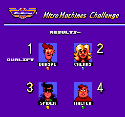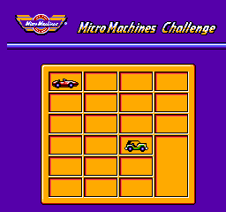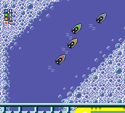 Viewed from overhead with small graphics, the races include up to 4 cars. In one player challenge mode you race through the 21 tracks in a set order, selecting your 3 opponents as you go along (adding a fair amount of strategy - ideally you should aim to eliminate the better CPU cars early on), eliminating one after every third race (assuming that you can finish in the top 2 of a race within your 3 lives). If you win 3 races in a row without using a continue you get a time-trial race which can earn you an extra life.