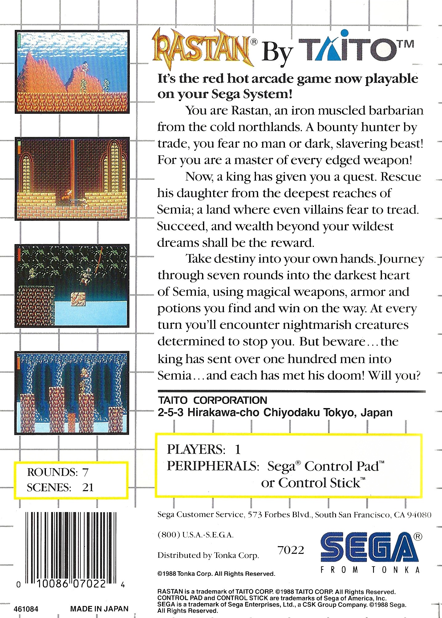 | description | You are ***Rastan*** a mighty warrior, that must use your two-handed sword (and any other weapons you find along the way) to battle many mythical beasts and creatures. Traverse dangerous waterfalls, lava pits, and swing from rope to rope before finally facing the Evil King! |