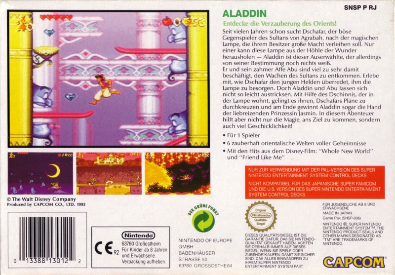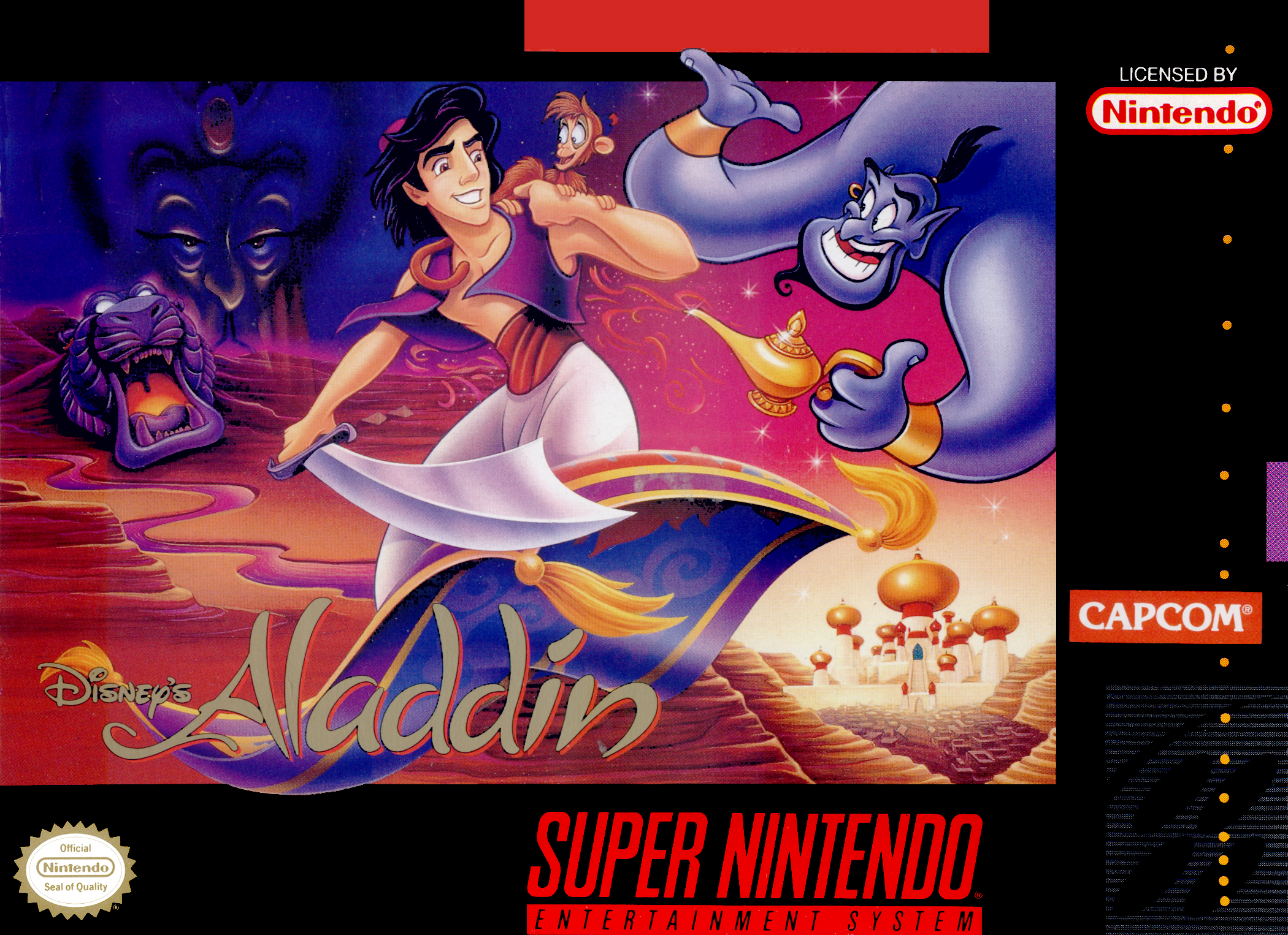 | __long_description | Disney's Aladdin is based on the 1992 Disney animated film. For the GBA and the SNES editions development was handled by Capcom. Like other versions, the game is a side-scrolling platformer where the player controls Aladdin through locations from the movie like the city of Agrabah, the Cave of Wonders, and Jafar's palace. Some locations not appearing in the film include a trippy, candy-colored world inside the Genie's lamp and an ancient pyramid. Enemies standing in Aladdin's way include the Sultan's guards, animals and various magical creatures. They can be dispatched by jumping on top of them or by throwing apples at them. Besides jumping and throwing, another one of Aladdin's abilities consists of him pulling out a blanket and using it to slow his fall.
