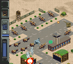 The game is played through the isometric-perspective, and the plane's speed and direction can be be adjusted in real-time. Altitude however, is fixed. A missile/bomb-target is constantly shown on the ground before the plane, allowing players to aim at units, or, with the F-15, a lock-on targeting system is available.