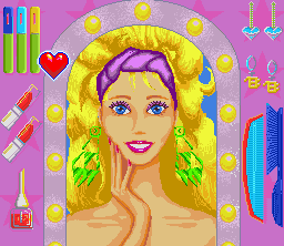 Barbie then goes back through the level right-to-left. On the return trip, there is a handbag to pick up. This brings you to another magazine cover. You then go to a makeup mirror where you must match Barbie's hairstyle, earrings, eyeshadow and lip and nail color to the cover. Again, you are awarded points for each item which you get correct.