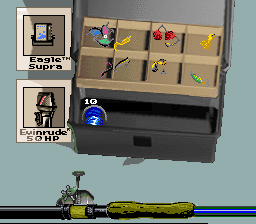 The player starts off choosing an angler. Then the player can either go to the bait shop, practice pond, or start in the tournament. In the bait shop, choices of baits, lines, rods, reels, fish finders, and boat engines are available for purchase. The practice pond mode is just where the player can cut his teeth on the game mechanics without consequence.