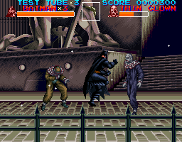 There are two varieties of the beat'em'up levels. One plays like Final Fight and similar games: Batman can move in two dimensions, beating up his enemies with various punches, kicks, combos and special moves. Special gadgets to be used include the famous Batarang to take out enemies from a distance and "Test Tubes" filled with chemical explosives which will damage all enemies on the screen.