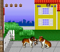 Your four puppies need to be rescued and brought back to their mom. As a responsible father and guardian you'll first need to find the puppy, avoiding dangers such as bad-tempered cats, mean dogcatchers, acorns which have a habit to drop down just when you pass underneath, and careless skateboarders. You can bark at these opponents to scare them away. And if you'll find a source of water (such as a rubber hose), you can make yourself wet and then - in a tense situation - shake off the water, eliminating everyone in the vicinity.