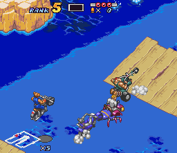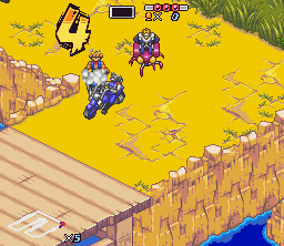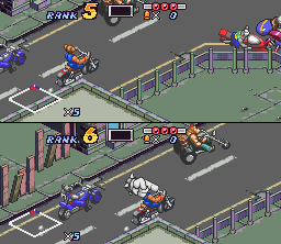 Based on the cartoon of the same name, Biker Mice From Mars is a racing game very similar to Rock 'n Roll Racing. Races are shown from an isometric perspective and you can choose between six different drivers that differ in acceleration, top speed and grip. During the races, you can use weapons such as mines or missiles to slow down your opponents and pick up random bonuses ranging from money to making you temporarily invincible. After each race, you will receive money that can be spent on better tires, armor, engines or weapons. There's also a two-player mode that lets you play the main race with a friend or compete in a one on one race.