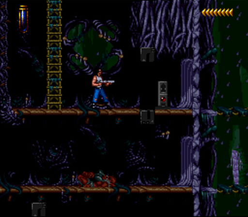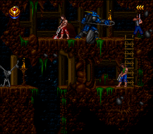 Blackthorne is a platform action game played from a side-view with non-scrolling backgrounds. It has certain similarities to Prince of Persia, being set in maze-like environments and focusing on exploration and occasional puzzle-solving. Blackthorne fights enemies by shooting at them. His default weapon, a pump action shotgun, can be upgraded throughout the course of the game. Various types of bombs can be used to damage enemies, blow open doors, or destroy generations. Keys must be often found to gain access to new areas.