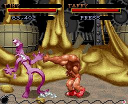 Clay Fighter is a 2D fighting game released in which the characters, as the name suggests, are made completely out of clay. This allows for interesting moves and stylized graphics. The zany roster includes: Bad Mr. Frosty, a snowman; Taffy, a piece of stretchable candy; Blob, a character who can morph into different shapes; Blue Suede Goo, an Elvis knock-off; Ickybod Clay, a pumpkin-headed ghost; Helga, an opera singer; and Bonker, the crazed clown. Each character also has their own level and individual taunts.