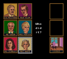 Based on the board game Clue. A murder has taken place in a mansion. You play as one of the 6 suspects in this case. You have to find out who committed the crime, and with what weapon and where in the mansion it took place in. There are 5 levels of difficulty which basically give you less information the harder up the level.