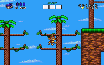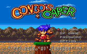 Congo's Caper is a side-scrolling platform action game. Being the second Tatakae Genshijin game, it is the sequel to Joe & Mac and controls very similar to that game. Players move Congo to different locations on a map, each representing one level. Controlling Congo, the player can move left, right, jump, duck, swim, climb ladders, roll down hills and swing his club to attack enemies. If Congo is damaged or hit by enemies, he reverts to a monkey form. Another hit as a monkey will kill him and use up one of his lives. To return to human form, Congo can collect a ruby or if he collects rubies while already human he can turn into an invincible Super Congo for a short while. Collecting 100 diamonds or 1 big diamond will give Congo and extra life while collecting sapphires will spin the slot machine (and possibilities of bonuses).