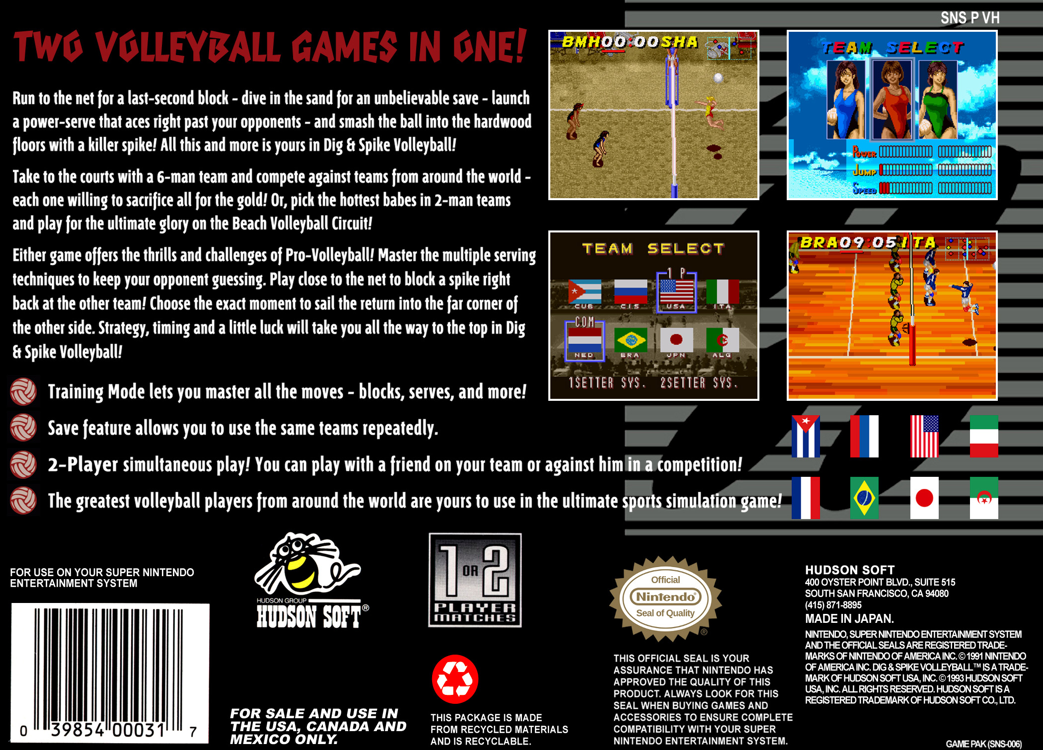 | description | Dig & Spike Volleyball is a Volleyball video game developed by TOSE and published by Hudson Soft in North America. In Japan the game is known as "Volleyball Twin" and was published by Tonkin House in 1992. |
