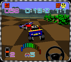 Dirt Racer is a racing game which is set on five off-road courses and offers three different vehicles (truck, buggy and stock car). The player participates either in a league (three divisions with eight drivers each) or a tournament with a knock-out system (also eight participants). The races itself are always one-against-one and the winner is who has the best end time. If the player drives in the water or against another obstacle, time is lost and the car gets set back on the course - but only for a limited amount of times; after that the race is lost. The controls feature two different acceleration speeds and three different braking strengths. Up to eight players can participate in the events, but the racing itself is limited to two at the same time.