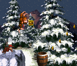 Donkey Kong is joined by Diddy Kong: these two primates differ significantly. For example, Donkey Kong is generally stronger; he can destroy most enemies with a single jump and can lift barrels straight over his head to throw them farther. On the other hand, Diddy is faster and not as strong as Donkey; he can run really fast and do cartwheels. Diddy carries barrels in front of him, creating a shield against frontal attacks.