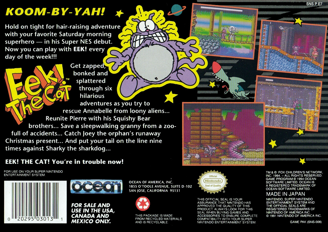 | description | A 1994 SNES action-platformer based on Savage Steve Holland's animated series about a selfless and luckless purple cat. Eek must protect his human owners from harm, usually putting himself in danger in the process. |