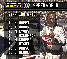 A 16-bit racing game based on the ESPN TV show of the same name. It resembles NASCAR but doesn't mention it by name due to licensing issues.