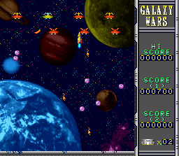 Galaxy Wars is a vertically-oriented Arcade game first released in 1979 by Universal Co. for the Japanese market. It is loosely inspired by Taito's Space Invaders - Taito would produce the cabinets for Galaxy Wars.