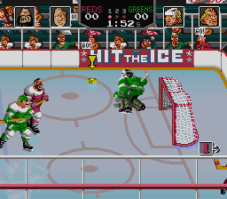 Hit the Ice is a fast-paced, high-impact hockey game. Having more in common with Midway's Arch Rivals than any sane hockey simulation, this arena is no place for penalties, and no place for wimps. While the idea is still to somehow put the puck into the opposing team's goal, each team only has three players, there is a heavy focus on checking, and it is possible to do a "super shot" which is strong enough to send the goalie into the net along with the puck.