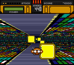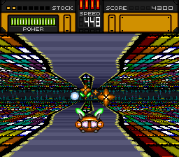 As a racing game, the resemblance is visual. The mode 7 "tracks" bear a resemblance to the well-known progenitor of mode 7 racing, F-Zero. As a rail shooter, in the same vein as Star Fox, the player's ship is constantly pushed forward through each level. While it is possible to slow down, doing so eventually causes damage to the player's ship.