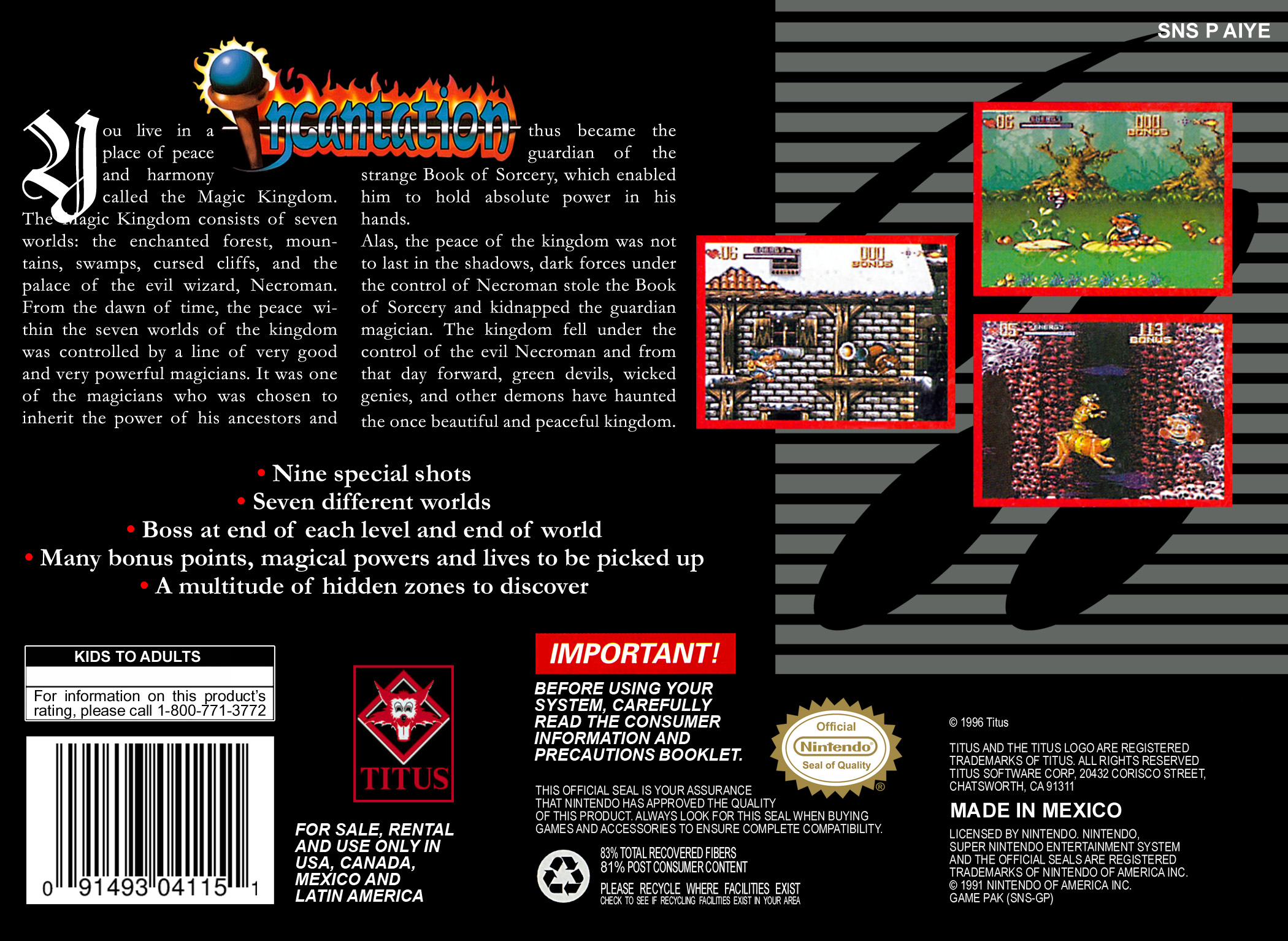 | description | Incantion is a fanntasy sidescroller made quite late in the life of the SNES. Watchoo know about wand-shooting? |