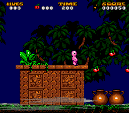 Jelly Boy is a gelatinous humanoid pink blob on a mission throughout some strange worlds. He travels throughout such landscapes as giant toy factories and arctic snowfields during his quest, facing down all manner of dangerous enemies and obstacles. He can jump and he can launch a large fist from his stomach (he is a blob, after all). Further, different levels have special power-ups that allow the blob to assume different forms that are useful in specific circumstances. These include a hot air balloon (for floating up to special items), a hammer (for smashing obstructing blocks), a submarine (for more effectively navigating an undersea bonus level), a skateboard (for blazing through a level on a deadline), and a pogo stick (for extra high jumping). Not all of the power-ups are useful, though. One item turns Jelly Boy into a block so that he is unable to move for several seconds.