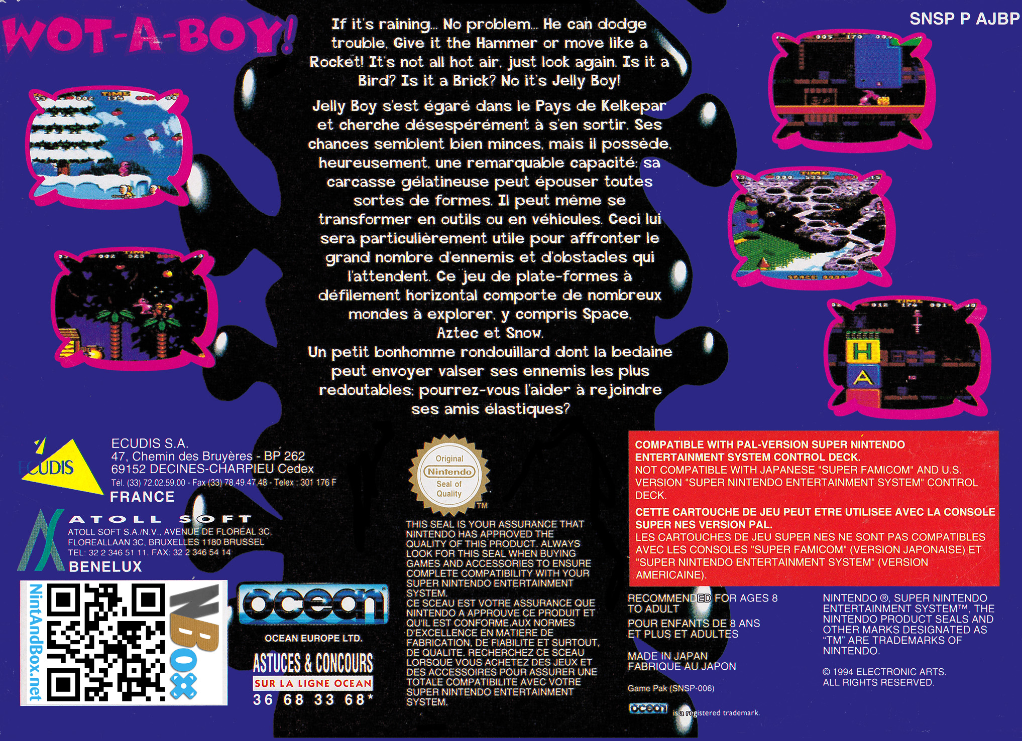 | description | Jelly Boy is a 2D side-scrolling platformer developed by Probe Entertainment and published by Ocean for the SNES and Game Boy. It was only available in Europe. |