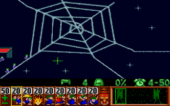 You are in control not of any individual Lemming, but of a cross-hair, which can be moved over any of the Lemmings. Along the bottom are a selection of functions which can be assigned to a Lemming, including climbing, floating and bashing. You must click to select the appropriate function, then click on the Lemming to activate it. Each level has a different range of skills on offer, a different amount of Lemmings, and a different percentage target in order to progress.