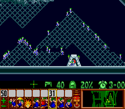 You are in control not of any individual Lemming, but of a cross-hair, which can be moved over any of the Lemmings. Along the bottom are a selection of functions which can be assigned to a Lemming, including climbing, floating and bashing. You must click to select the appropriate function, then click on the Lemming to activate it. Each level has a different range of skills on offer, a different amount of Lemmings, and a different percentage target in order to progress. |