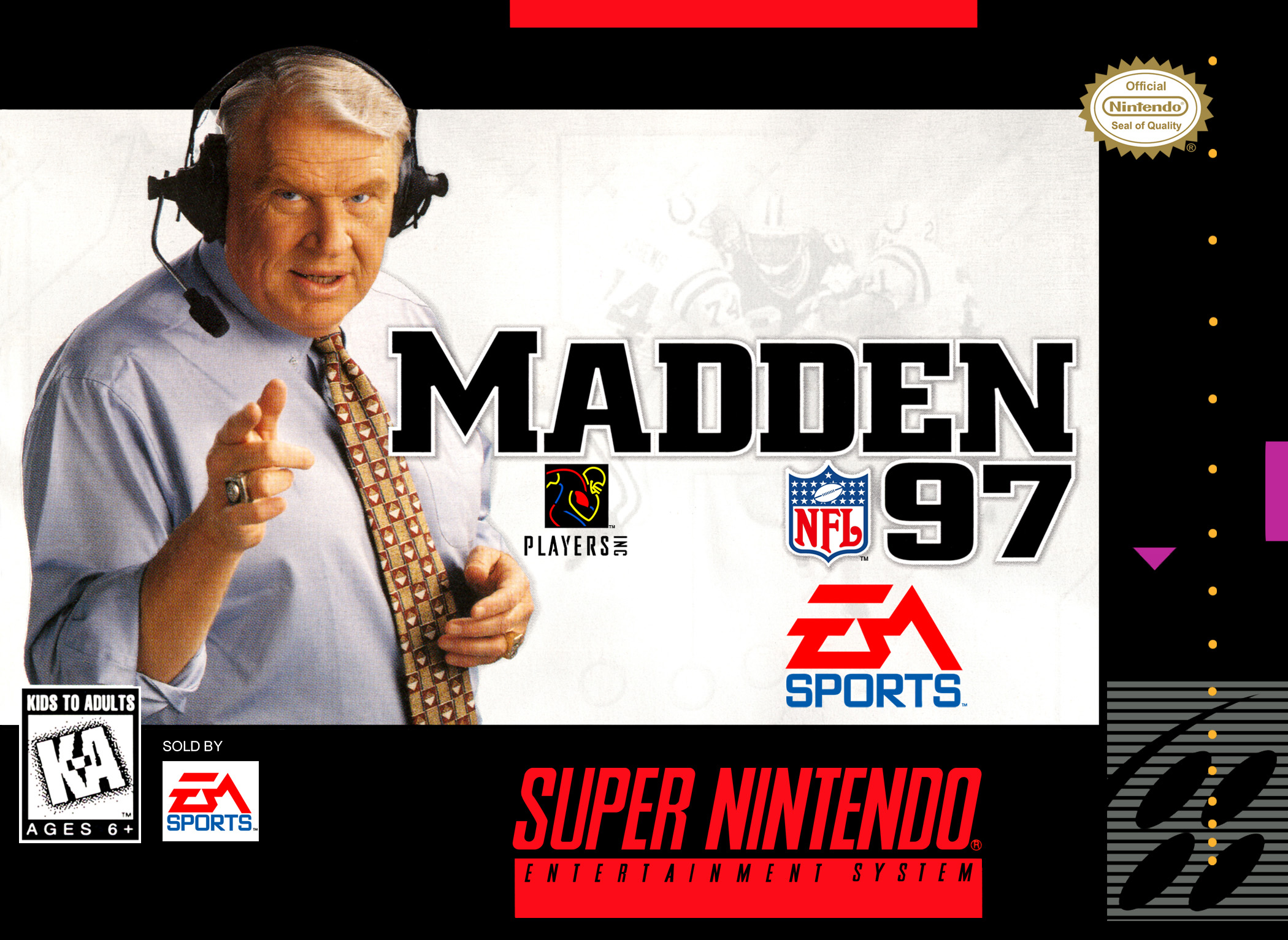 | __long_description | Madden NFL 97 is a football simulation game the seventh core entry in EA's Madden NFL series, endorsed and featuring sports commentator John Madden. The game was the first in the series to be released on the 32-bit generation, specifically the Sony PlayStation and Sega Saturn. It also saw releases for the SNES and Genesis like its antecedents. It's also the last Madden to be released on the Game Boy.