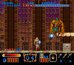As you progress through the tower, you will be granted new magical weapons after each boss you defeat. The weapons are affected by a "magic bar" that charges over time. When this bar is fully charged, the weapon has a powerful ranged attack, but when not charged only a close attack is produced. A magical staff will grant increased range attack ability. A magical blast may be generated by jumping and attacking, but doing this costs health.