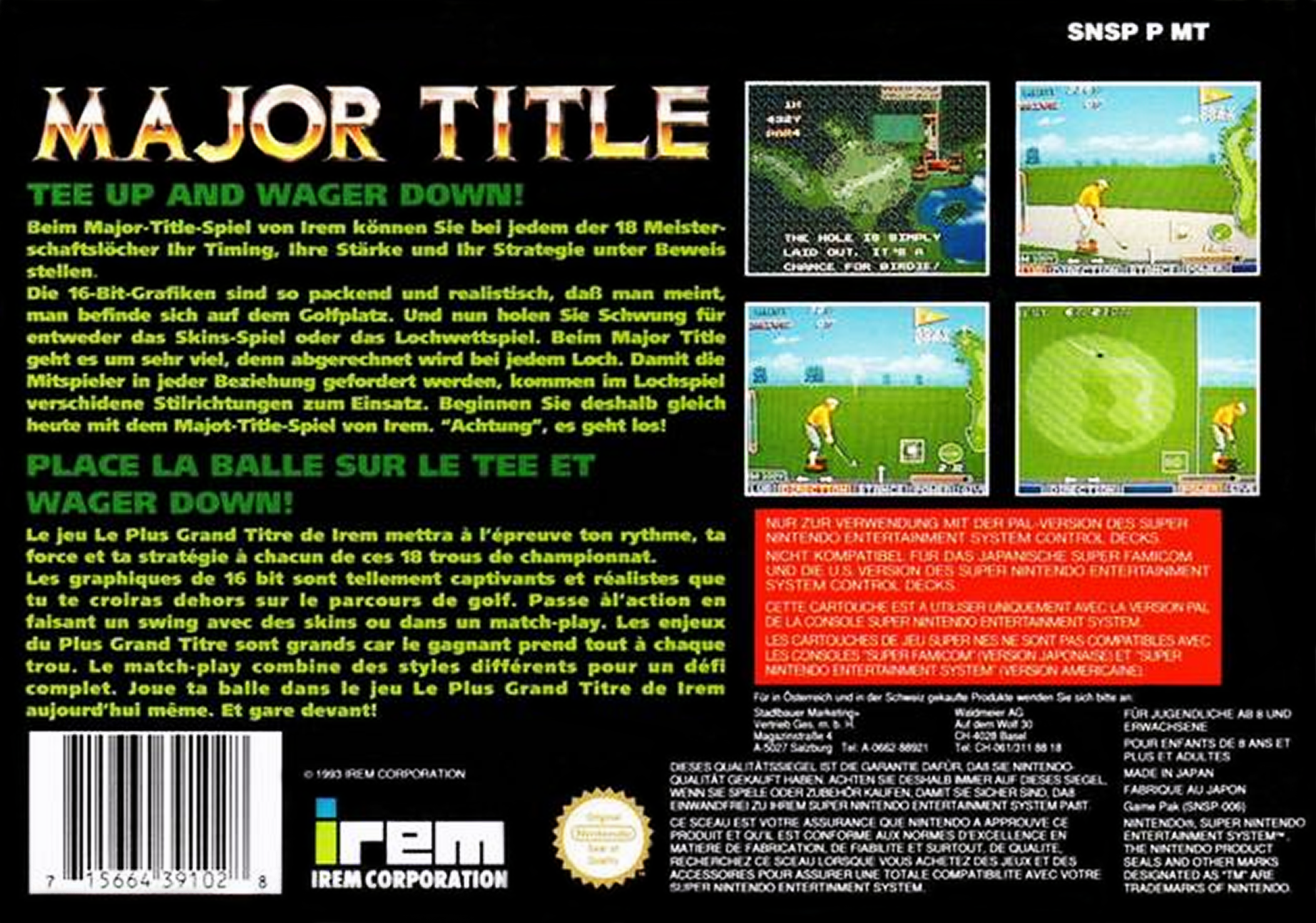 It was also ported to the Super Nintendo Entertainment System in late 1992, titled outside of North America as Major Title. Although it only has one course and no persistent records, it retains the pacing and simplified controls of the arcade version (compared to games like True Golf Classics: Pebble Beach Links and Jack Nicklaus Golf). |