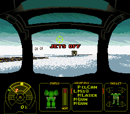 During an actual mission, gameplay is seen from a first-person cockpit perspective, with the SNES' Mode 7 employed for a pseudo-3d effect. Specific parts of enemy 'Mechs (torso, arms and legs) can be targeted, with expected effects: losing arms also loses weapons, while damaged legs hinder movement.