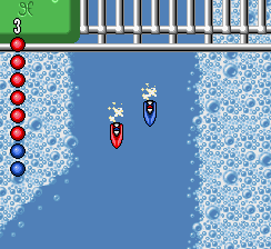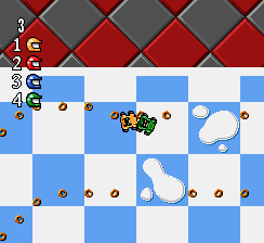 Viewed from overhead with small graphics, the races include up to 4 cars. In one player challenge mode you race through the 21 tracks in a set order, selecting your 3 opponents as you go along (adding a fair amount of strategy - ideally you should aim to eliminate the better CPU cars early on), eliminating one after every third race (assuming that you can finish in the top 2 of a race within your 3 lives). If you win 3 races in a row without using a continue you get a time-trial race which can earn you an extra life.