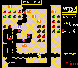 You control Mr. Do has he tries to harvest all of the cherries on the screen. However, there are numerous bad guys out to get him! Mr. Do can defend himself from the badguys in two ways: first he can push the apples located throughout the playfield on top of the enemies and crush them. Secondly, Mr. Do is armed with a power ball. This can be thrown to destroy an enemy. Mr. Do has only one power ball, though, so he will need to wait for it to return to him before it can be used again. From time to time an alpha monster will appear on the screen bearing one of the letters in EXTRA. If you use the power ball to destroy an alpha monster you earn that letter; when you've earned the complete word EXTRA you receive an extra life. When you successfully collect all of the cherries, you will move on to the next, more difficult level.