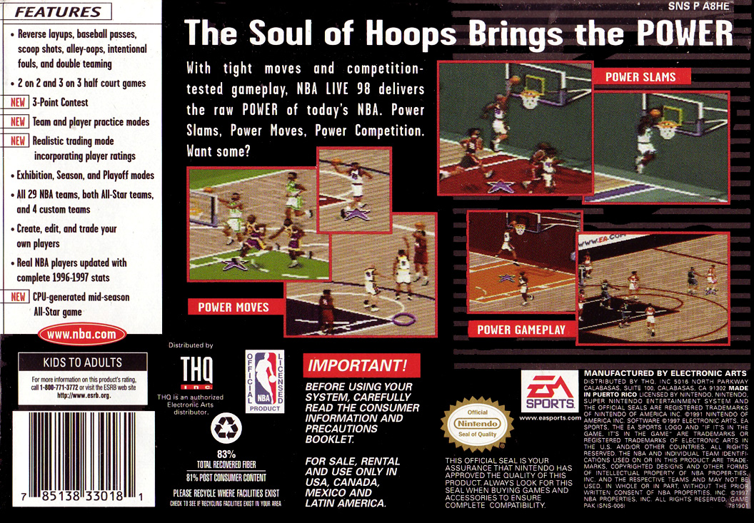| __long_description | NBA Live 98 is a multiplatform basketball game and the fourth game in the NBA Live series from EA Sports. The game was the last in the series to be released on the Sega Genesis and the Super Nintendo Entertainment System. It features all the teams and players of the 1997/98 NBA season.