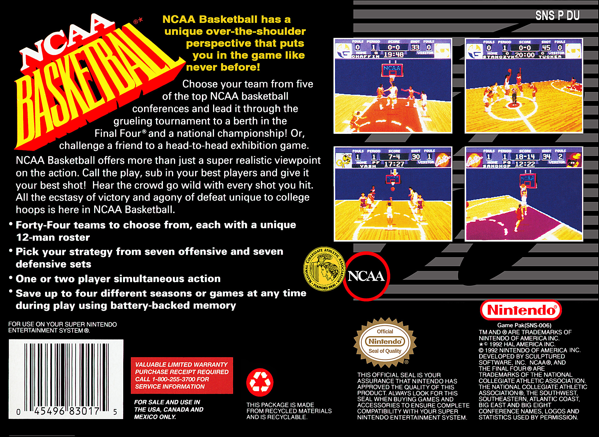| description | The first basketball game to utilize a dynamic 3D behind-the-ball perspective thanks to the system's Mode 7 technology. While it uses fictional teams in other regions, the North American release uses real college teams and is the first licensed video game with the NCAA. |