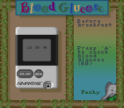 This side-scrolling platform game was designed to teach children with juvenile diabetes how to take care of their condition to avoid the need for urgent care. You play as one or both (in a two-player game) diabetic elephants, Packy & Marlon, in Camp Wa-kee which has been invaded by rats that have stolen food and medical supplies. The elephants must find where the supplies are hidden around the camp while also remembering to check their blood glucose levels, taking insulin, having a balanced diet in three meals and three snacks a day, and handling diabetes emergencies.