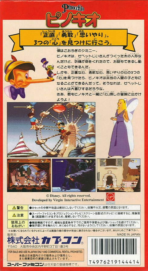 | __long_description | Pinocchio is a 2D side-scrolling platformer based on the 1940 Disney movie of the same name, and roughly follows the same plot. It follows on from Virgin Interactive's previous 16-bit platformers, such as The Jungle Book and The Lion King, and like those games puts special consideration towards the game's fluid animations and fidelity to the source material.