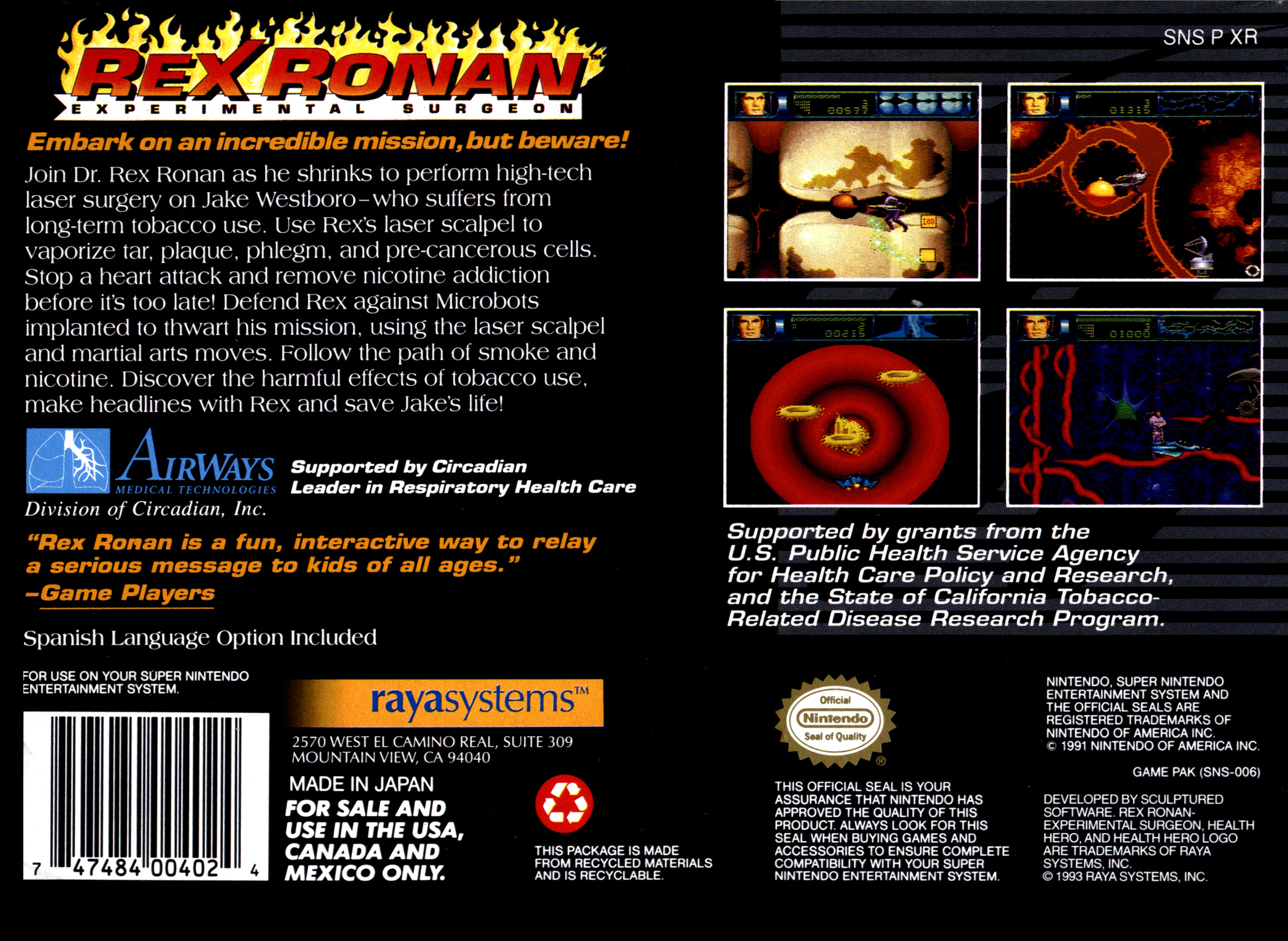 | __long_description | This game comes at you with a Fantastic Voyage tale of a microsurgeon miniaturized to a near-microscopic scale in order to enter the body and save the life of a tobacco salesman, ironically laid low by health complications caused by the very cigarettes he sold. Rex must be asking himself, "My parents put a mortgage on their house to put me through eight years of medical school just so I could scrub tar off someone's lungs like a window-washer?" But it gets worse: Big Tobacco, pre-emptively attempting to silence the turnabout whistleblowing revelation they anticipate in the unlikely event of this salesman's recovery, have some shrinking technology of their own, and have introduced sinister nanobots into his body to ensure his -- and Rex's -- untimely demises.