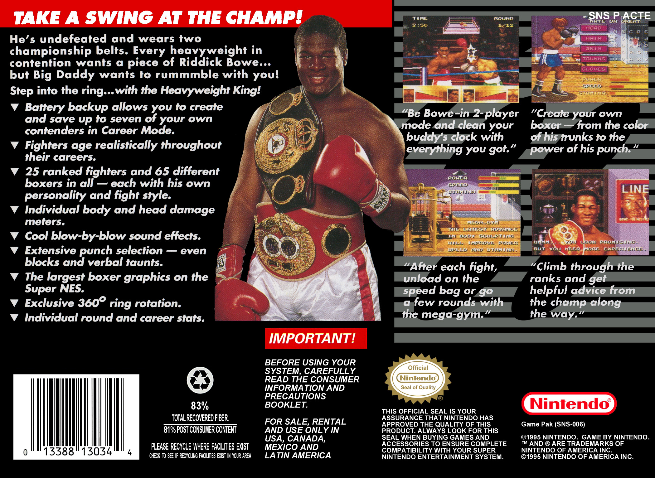 | description | The official boxing game of Heavyweight Boxing Champion, Riddick "Big Daddy" Bowe. One of the many popular boxers of the 1990s. |