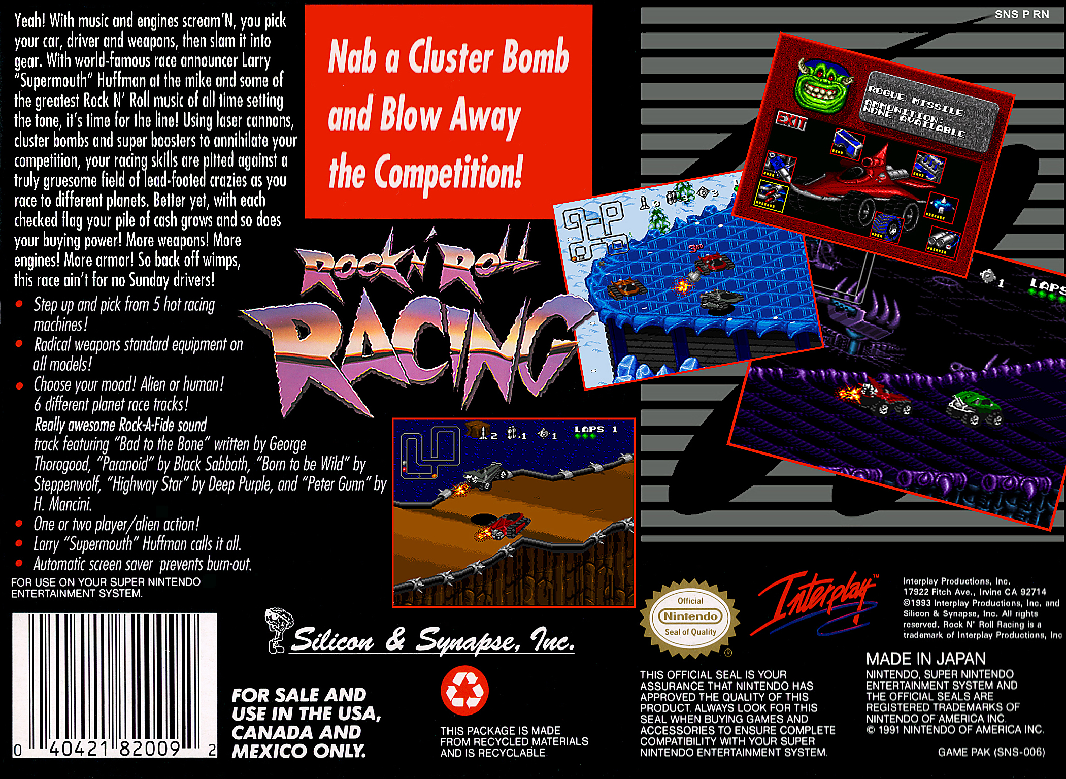 Blizzard later re-released Rock N' Roll Racing on the GBA. A demo version of the game was uploaded onto their PC online service Battle.net, emulated through ZSNES. The game's lasting legacy means it continues to see imitators to this day. |