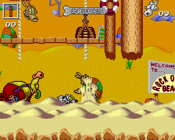 Rocko's Modern Life is a side-scrolling action game where the player takes control of the Nickelodeon character, Rocko, as they travel through three different stages (Rock-O-Whey Beach, Hill-O-Stench garbage dump, and Laundryland) trying to protect his beloved dog Spunky from the various dangers throughout the stages.