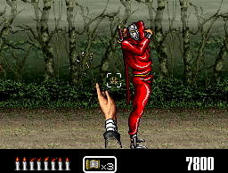 Shien's Revenge is a first-person Operation Wolf-style shooter that puts the player in the role of Shien the ninja. Movement is automatically controlled by the game, which scrolls horizontally or vertically. The player must use his weapons, long-range shuriken (throwing stars) and a close-range dagger in order to defeat various enemy ninjas and creatures that appear on the screen. A set of candles indicate the player's life meter. Power-ups such as rapid fire and scrolls can be picked up by defeating enemies. The use of scrolls produces a powerful attack that damages everything on the screen. At the end of each area, the player encounters a boss who must be defeated through the depletion of its life meter. |