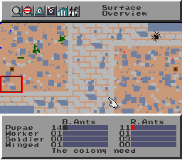 SimAnt explores the detail of the lives of ants, as you take full control of an ant colony. Build up your colony to conquer the other colonies in the yard. Foes include spiders and humans - make their lives a misery by invading their homes. A Quick Game option focuses on battles with other groups of ants, and a full Tutorial mode is provided. Biological detail of real ants is provided, to help make the package more educational.