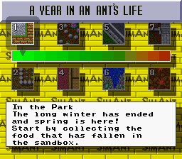 The player can switch from controlling one ant to another as necessary to do different tasks in the game directly. They can go out on the surface and collect green food dots, call in the troops and take down spiders and caterpillars or invade the red ants’ hill and kill them off. While out on the surface it is important to be careful not to drown in the rain or get killed by the lawn mower.