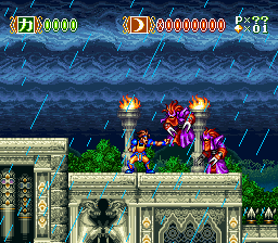 Skyblazer's basic structure is similar to many platformers of the era: he must pass through and conquer a series of stages, defeating the bosses along the way, on his quest to gain power and reach the last stage where Ashura and the dark god Raglan await. There is the occasional branching path as well, which allows the player try a different stage if they're having trouble with the current one. As well as jumping and attacking, Sky can also climb walls and leap off them as well as use several offensive and defensive spells, many of which also increase his ability to traverse a stage as well. Some aerial stages require that Sky take to the air with his wings, a few of which use the Super Nintendo's Mode 7 functionality - these stages play a lot more like a shoot 'em up.
